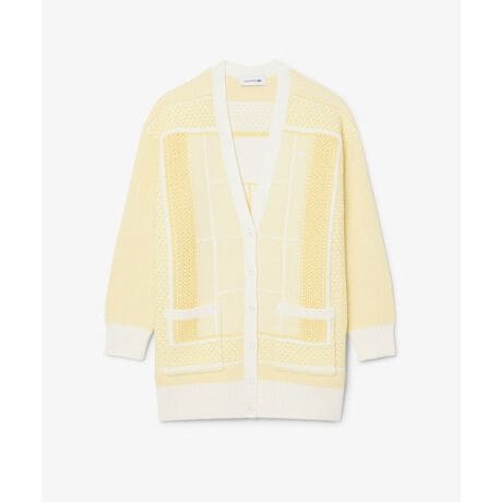 [型番:AF9871-10]ラコステのバックボーンを体現するテニスコート柄を纏ったロングニットカーディガン・オーガニックコットンとナイロンをブレンドしたニット素材・全体を使用した編地の切り替えでテニスコートのモチーフをジャカード・ほど良い厚みで着回しやすい5ゲージのミドルウェイト仕立て・トレンドに寄り添うリラックスフィット×ドロップショルダーシルエット・左胸にボディと同色のワニロゴパッチRegular Fit