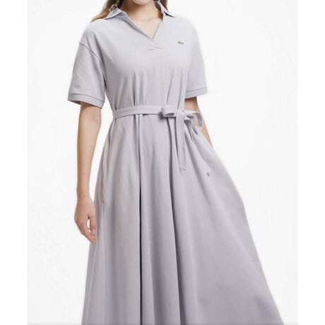 [型番:EF038J-99]スポーティーな風合いとエレガンスを兼ね備えるスキッパーネックポロドレスさらっと快適な着心地を生むコットン100%仕立ての鹿の子素材・ゆったりとしたフレアシルエットのマキシ丈ドレスデザイン・定番のポロカラーデザインをスキッパーネックでエレガントに・ブラウジングも楽しめる共地のウエストベルト付きRELAXED FIT