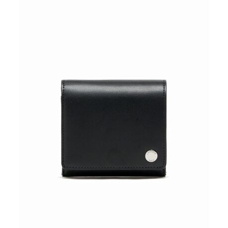 [型番:NF1711KP]上質で滑らかなレザーにシルバーブローチが映える2つ折りミニウォレット・上質で滑らかなスプリットカウレザー・右下にラコステ パリの刻印入りシルバーブローチを配置・スナップボタン開閉でコンパクトな2つ折りデザイン・口開きが良く小銭が見えやすいボックスタイプのコインポケット・カードスロットと札入れを備えたミニマルな内装設計・内側にワニロゴ箔押し