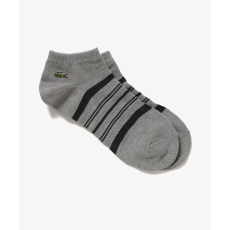 [型番:RA485J-99]カジュアルなデザインにスポーティーな機能性を添えるメッシュ切り替えボーダーくるぶし丈ソックス・コットンとポリエステルを軸としたブレンドニット素材・一部をメッシュ編みにして通気性を確保・カジュアルなアクセントを生むボーダーデザイン・履き口にワニロゴパッチを配置