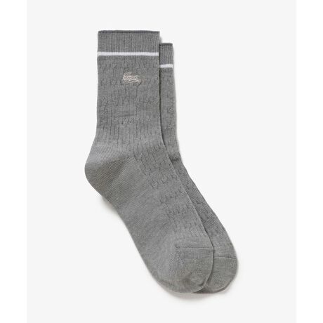 履き口の配色ラインが際立つケーブルニットソックスエレガントなケーブル柄に履き口の配色ラインでスポーティなフィーリングをミックスしたケーブルニットソックス。ボディと同色のワニロゴがシックなアクセントに。コットン×ポリエステルのブレンドニット素材の絶妙なフィット感と足底のパイル編み切り替えのクッション性が、一日中快適な履き心地をサポートします。