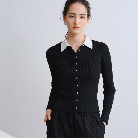 着回ししやすいベーシックなカラーに、白い襟が上品な印象のリブニットカーデ。襟部分も編地なので肌なじみが良くゴワゴワしないので着心地抜群です!パールボタンがエレガントですが、デニムなどと合わせたカジュアルスタイルもおすすめです。
