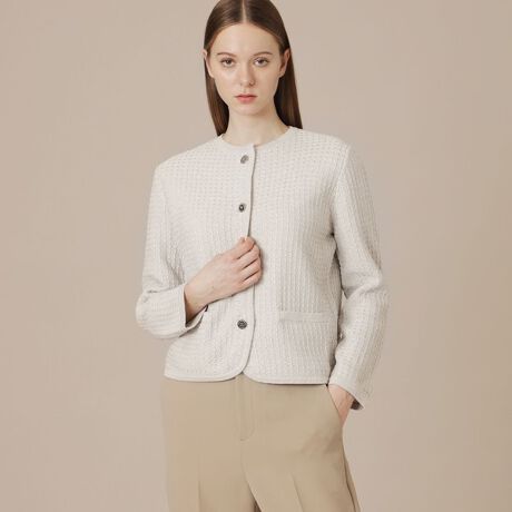 上品なツイード調ニットジャケットです。同色系でまとめた無地ライクなツイードを使用し、様々なアイテムと合わせやすく、カーディガン以上ジャケット未満な便利な一枚です。金属ボタンが、洗練された雰囲気をプラスしています。