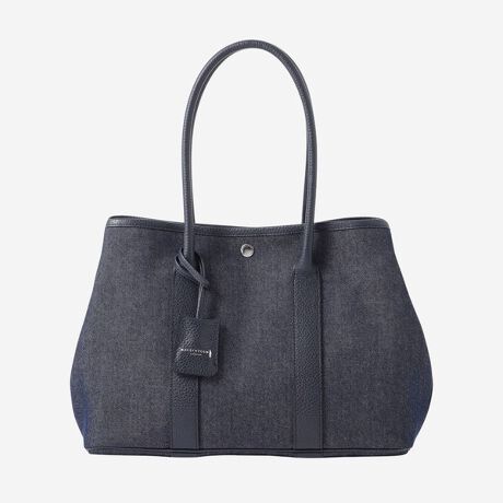 [型番:G5105714__]色落ちしにくいデニムを使用したトートバッグです。革はイタリアのシュリンク型押レザー、裏地にはコットンを使用。中央のドット釦で開閉でき、また、マチのドット釦でマチの形を変えられます。内側にはファスナーポケットと仕切りポケット付き。職人によって丁寧に作られたMADE IN JAPANのバッグです。