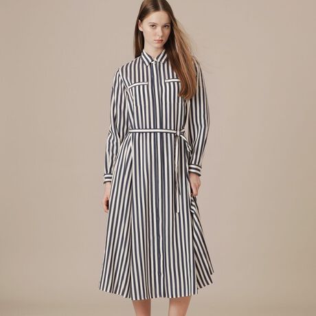 サイドの切り替えパーツ、ポケット口、カフスをボーダー使いにしたワンピースです。ベルトを締めてシルエットにメリハリをつけたり、羽織りとしてもお召しいただけコーディネートの幅が広がるアイテムです。アンダースカート付きです。同素材のジャケット(品番:G5E18729)もご用意しております。