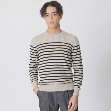 混合して表現した糸を使用した「ボーダーケーブルクルーネックニット」。