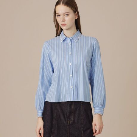 繊細なハシゴ刺繍を衿とカフスに施した、ボックスシルエットの上品なブラウスです。短めの着丈で、細身のパンツからワイドパンツスカートなど、さまざまなボトムとバランス良く合わせていただけます。同素材のブラウス(品番:G5M18715)もご用意しております。