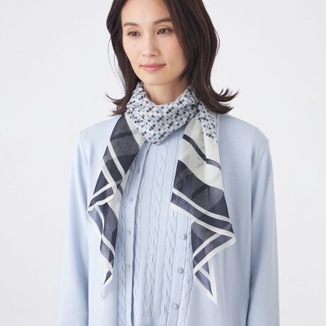 [型番:U1701712__]【ウォッシャブル】剣先幾何ストール定番の優しくやわらかなタッチの素材です。オリジナルの幾何柄に合わせやすいトーンの水玉幾何柄をプリントしました。スーツの胸元を華やかに演出します。