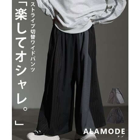 ストライプ生地を切り替えたデザインが目を惹くワイドパンツ。脚のラインを拾わないゆったりシルエットで、ラクに穿けるのに雰囲気はしっかりモード。シンプルなトップス合わせでも、こなれた印象に仕上がります!