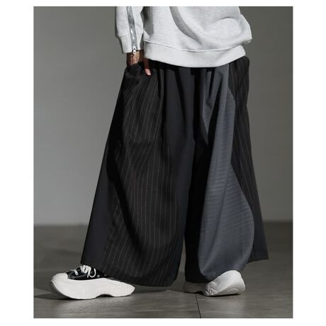 ストライプ生地を切り替えたデザインが目を惹くワイドパンツ。脚のラインを拾わないゆったりシルエットで、ラクに穿けるのに雰囲気はしっかりモード。シンプルなトップス合わせでも、こなれた印象に仕上がります!