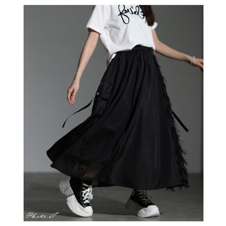 【スカート】 異素材 フレア シャギー メッシュ カーゴ ポケット ロング ウエストゴム 黒 茶色