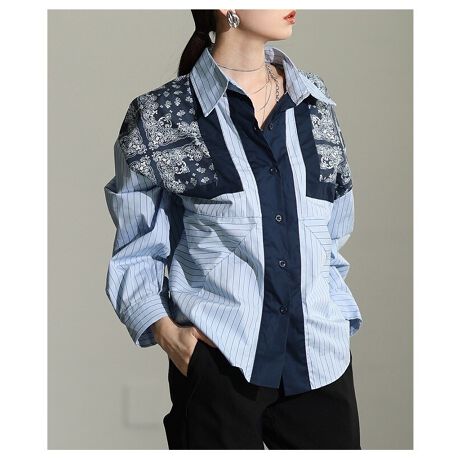 【トップス】 シャツ ブラウス ストライプ ペイズリー 異素材 長袖 羽織り ブラウン ブルー