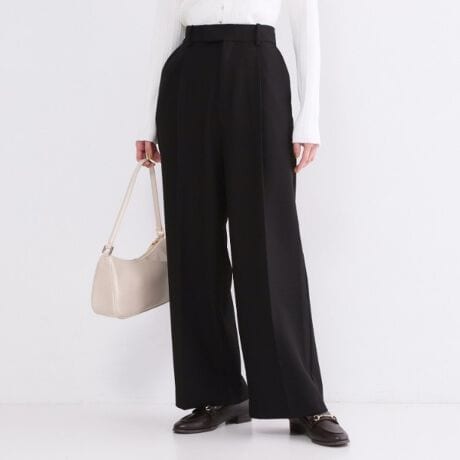 ・太めのベルト幅と腰回りに入ったタック、センタープレスなど、脚全体を縦長に見せるために計算されたデザイン。