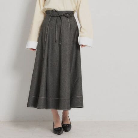 デニムライク素材を使用した配色ステッチが目を惹くフレアスカート。