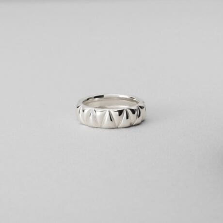 立体的に描かれるキルトパターンが、指元に奥行きある表情をもたらすリング。