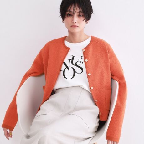 ・ふわふわとした表面感が特徴のブークレ糸を使用した、ほどよい厚みのクルーネックカーディガン。