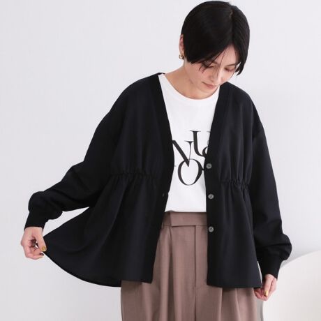 ・ギャザー切り替えのペプラムシルエットが、一枚で着てもサマになるデザイン。