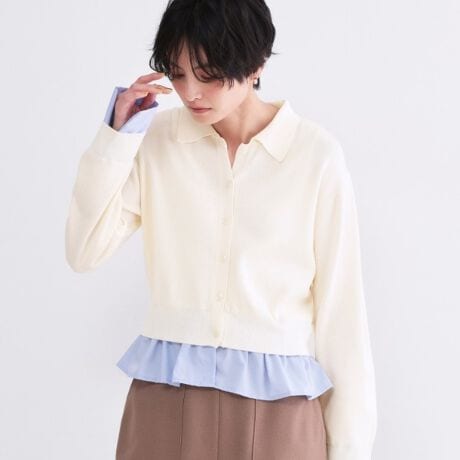 ・袖口と裾にシャツ素材をドッキングさせ、レーヤード風に見せた着こなしが可能なニットカーディガン。
