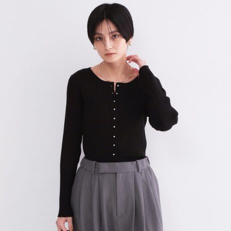 ・リブニットカーディガンに、シルバーの小粒丸ボタンを多めに並べたデザインで、トレンド感たっぷりのニットカーディガン。