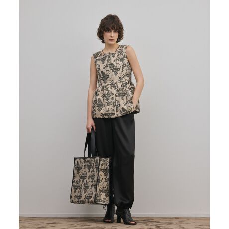 【JapanFabric】 コーディネートの主役に相応しい、日本製のジャガード地で丁寧にお作りしたクラス感溢れるペプラムベスト。細かな線まで表現した特殊なジャガード素材は、特有の重さや分厚さはなく、とても柔らかくて薄いのがポイント。見た目にも非常に綺麗で、着心地も良い一着となっています。そこにオリジナルで作成した繊細なタッチのアニマル柄を表現して、他にはない新鮮な表情に仕上げました。ウエスト位置からふわっとさせた、広がりすぎないやや丸みのある可憐なペプラムシルエット。首元はスクエアタイプで、シャープな印象をひとさじプラスしました。まだ肌寒い時はニットなどを中に添えて、暖かくなったら一枚で、お揃いのスカートを合わせた新鮮なセットアップスタイルにと、様々な着回しをお楽しみください。。