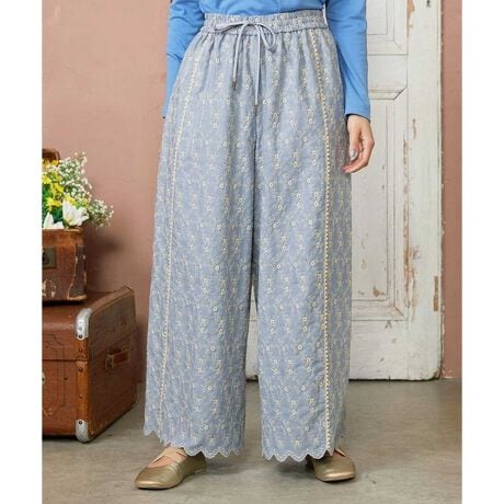 繊細な花柄の総刺繍を全面に施した贅沢なワイドパンツ。ほどよいフレアシルエットで体のラインを自然にカバーします。ウエストはオールゴム仕様でリラクシーな着用感。紐も通してあるのでサイズ感の調節も可能です。裾のスカラップや切り替え線に施したレースがアクセントとなり、女性らしい印象を後押しします。華やかな総刺繍のパンツは今季イチオシのオススメアイテムです。