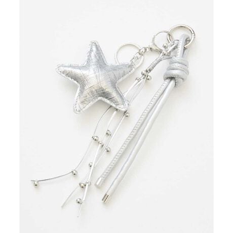 ・星型の合皮パーツや小さな丸いパーツをちりばめたコード使いのインパクトのあるチャームです。