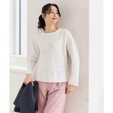・ボートネック風のデザインで首元は開き過ぎず、顔まわりをすっきりと見せてくれます。
