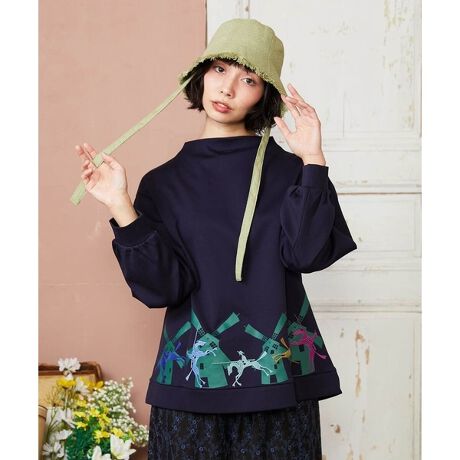 こだわりの詰まったカットソープルオーバー。立ち襟と裾に向かってフレアになっているシルエットが大人かわいい印象を後押しします。裾にはぐるりと風車のプリントと馬の刺繍を組み合わせたデザインを施し、ドン・キホーテの物語の一幕を再現しています。一枚で主役になるカットソーはデイリー使いにぴったりなアイテムです。