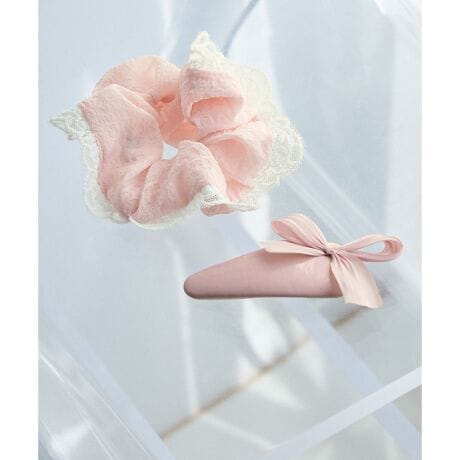 ・ぷっくり感のあるリボン付きのヘアピンと端にレースをあしらったシュシュのセットアクセサリー。