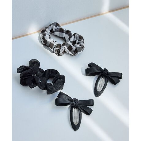 ・細巾のシュシュが2つとリボンピンが2つセットになったヘアアクセサリー。