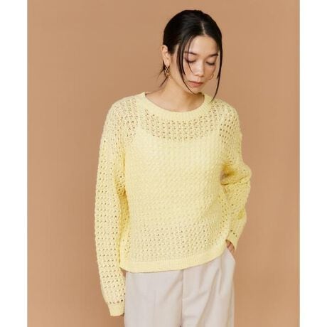 ■デザインざっくりと編み立てられた立体的な透かし柄ニット。主張し過ぎない華やかなキラキラ感と、ゆたったりとしたサイズ感が上品な印象の一枚です。やや短めの着丈なので、ゆったりシルエットでもバランスが良く、この一枚でスタイリングのポイントになるニットです。■素材シルクを長年に渡り扱ってきた紡績メーカーにより、上質なシルクだけを厳選して使い紡績されたシルクコットンの素材です。シルクには長繊維特有の上品な光沢があり、滑らかな肌触りとシワになりにくい特性を持ちます。また、タンパク質が主成分の為、とても肌なじみが良く吸質性と放湿性などの機能性にも優れています。上質なシルクと合わせるべく、コットンもまた白度が高く発色性の良い上質な超長綿を使用しています。上質な素材で極細に撚糸された、上品かつ繊細な質感と柔らかい着心地で包み込んでくれる素材です。・水洗い可■サンプル撮影商品画像の商品はサンプルです。実際の商品とはサイズや色味、素材、デザイン等の仕様が若干変更になる場合がございます。■カラーについては、可能な限り実際の商品に近いカラーで撮影をおこなっておりますが、照明の関係により実際の製品とは色味が違って見える場合があります。またパソコン・スマートフォンなどの環境により、若干製品と画像のカラーが異なる場合もございます。現物と画像のカラー差異については返品理由となりませんので、予めご了承ください。■サイズ表記はあくまで目安となります。