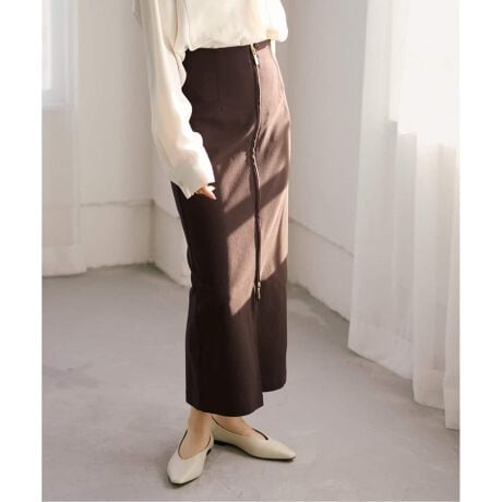 フロントジップのデザインがアクセントになったタイトロングスカート。