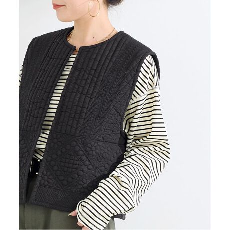 コットン素材にミシン刺繍で繊細な柄を中綿キルティングしたベスト。