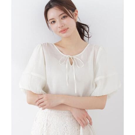 五分袖のボリュームスリーブが目を引くシアーブラウス。ほどよいボリュームスリーブなので、オンにもオフシーンにも取り入れやすいです。襟元のリボンが映え、女性らしさを引き立てながらキレイめに着用いただけます。