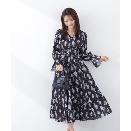 オリジナルのフラワー柄を使用したワンピース。着用時のシルエットにこだわったオリジナルパターンで、スタイルアップが叶う一枚。手首がきゅっと締まるスリーブもアクセント。後ろウエストはシャーリングゴムでフィットします。春らしいブルーはおすすめカラーです。