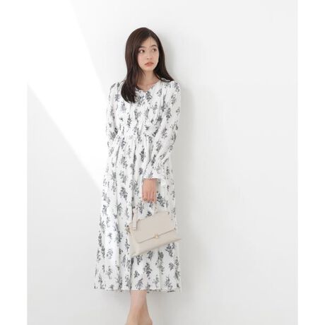 オリジナルのフラワー柄を使用したワンピース。着用時のシルエットにこだわったオリジナルパターンで、スタイルアップが叶う一枚。手首がきゅっと締まるスリーブもアクセント。後ろウエストはシャーリングゴムでフィットします。春らしいブルーはおすすめカラーです。