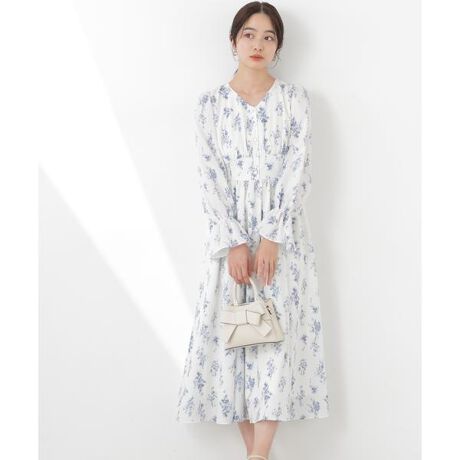 オリジナルのフラワー柄を使用したワンピース。着用時のシルエットにこだわったオリジナルパターンで、スタイルアップが叶う一枚。手首がきゅっと締まるスリーブもアクセント。後ろウエストはシャーリングゴムでフィットします。春らしいブルーはおすすめカラーです。