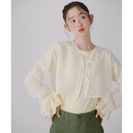 春らしい軽やかさを纏えるレース羽織ブラウス。ニットやカットソーに重ねるだけで、旬のレイヤードスタイルが完成します。軽やかな着心地なので、春のお出かけやデイリーコーデにぴったり。ショート丈でスタイルアップを期待できます。フロントリボンを結ぶデザインが、程よい抜け感とカジュアルな印象を叶えてくれます。<素材>透明なメッシュ地にレース柄の刺しゅうを入れた生地を使用しています。<詳細>仕様・前リボン裏地・なし透け感・あり / 光沢・ややあり / 伸縮性・なし 生地の厚さ・薄手※モデルの着用画像の場合、光の当たり具合により、実際の色味と異なって見えることがございます。色味は、商品単体の画像をご参照ください。