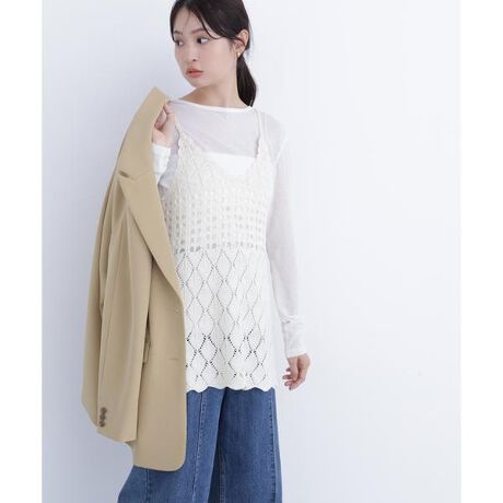 カギ編みで仕立てたキャミソールニット。レイヤード仕様のアイテムで、コーディネートに取り入れると映えるデザインです。軽やかでカジュアルな雰囲気を出しながら、季節のスタイリングに活躍してくれます。<素材>編み目が立体的で、カジュアルながら表情豊かな素材感です。<詳細>仕様・開閉なし裏地・なし透け感・あり / 光沢・なし / 伸縮性・あり 生地の厚さ・普通※モデルの着用画像の場合、光の当たり具合により、実際の色味と異なって見えることがございます。色味は、商品単体の画像をご参照ください。