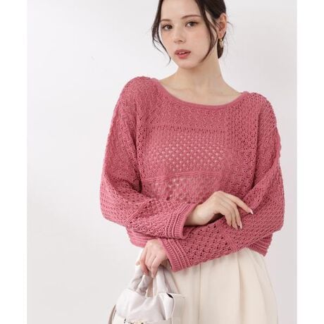 カジュアルなボックスラインがかわいい透かし編みニット。ブロックごとに異なる柄で編まれており、一枚で存在感のあるスタイルが完成します。カジュアルなパンツから、フェミニンなマーメイドやナロースカートまで幅広く着回せます。