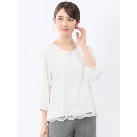 お顔まわりを華やかに演出してくれる、7分袖のプルオーバーブラウスです。前身頃の大柄のスカラップレース、切り込みが入ったネックデザインとゴールドのホック、袖口のふんわりギャザーがポイント。キチンと感のあるクリーンなルックスなのでオンオフ兼用で大活躍してくれます。