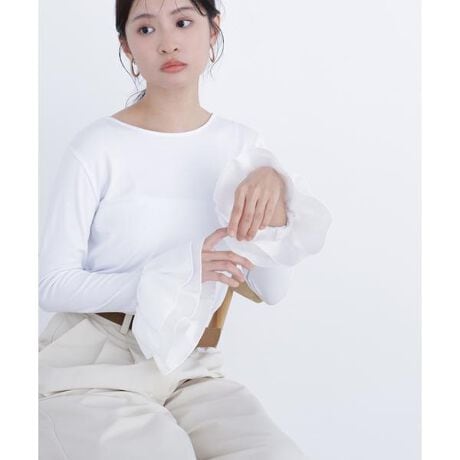 布帛のフレアカフスがポイントのカットソー。コンパクトなシルエットが、ジャンスカとのレイヤードにもおすすめ。トレンド感のあるデザインで、今年らしいスタイリングを叶えてくれます。布帛のフレアカフスと組み合わせることで、着心地の良いカットソーも品の良い表情をプラス。シンプルながらディテールに差がつく、一枚持っていると便利なアイテムです。<素材>柔らかく肌ざわりの良いカットソー素材を使用しています。<詳細>仕様・開閉なし裏地・なし透け感・なし / 光沢・なし / 伸縮性・あり 生地の厚さ・普通※モデルの着用画像の場合、光の当たり具合により、実際の色味と異なって見えることがございます。色味は、商品単体の画像をご参照ください。