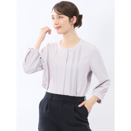 お顔まわりを華やかに演出してくれる、8分袖のプルオーバーブラウスです。フロントのピンタック、比翼風の前立て、切り込みが入ったネックデザイン、衿元と袖口にツヤっと光るボタンがポイント。キチンと感のあるクリーンなルックスなのでオンオフ兼用で大活躍してくれます。