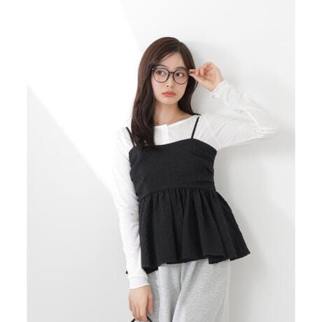 ペプラムシルエットが柔らかな印象を与え、腰まわりをさり気なくカバーするビスチェ。膨れジャガード素材で抜け感があり、アウトスタイルが様になるデザインです。背中はシャーリングゴム仕様でフィット。肩紐は長さ調節ができ、レイヤードスタイルを楽しめます。