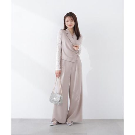 共地ベルトをドッキングしたワイドパンツ。ウエストはすっきりと、裾にかけて広がるシルエットがキレイな印象を叶えます。ウエストはサイドゴム仕様でフィット感と動きやすさを両立し、後ろ姿もすっきり見せてくれます。同素材のジレとのセットアップスタイルもおすすめです。
