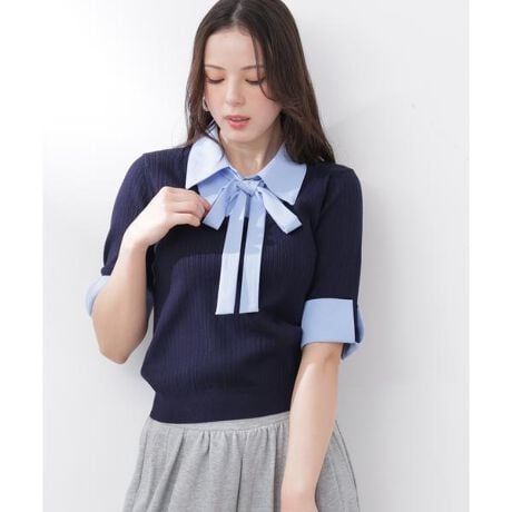 トレンドのシャツ襟ドッキングニット。細めのリボンタイがフェミニンな雰囲気を演出し、台襟付きできちんと見えを叶えます。身頃はニット素材で動きやすくデイリーに活躍。デニムやミニスカートとのカジュアルスタイルはもちろん、シックなワイドパンツ合わせもおすすめです。