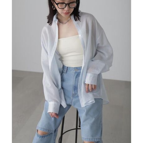 毎年ご好評の人気のシアーシャツとストライプシャツの要素を詰め込んだシアーストライプシャツ。マニッシュなイメージになりがちなストライプシャツをシアー素材にすることで女性らしく着られます。爽やかなカラーと程よいオーバーシルエットでで抜け感も演出。キャミやタンクにさらっと羽織るのはもちろん、薄手なのでジャンスカビスチェのインナーに合わせても収まりが良く今年らしくておすすめ◎オフ・ピンク・サックスは昨年実績カラー。ブルーが新色です。※モデルの着用画像の場合、光の当たり具合により、実際の色味と異なって見えることがございます。色味は、商品単体の画像をご参照ください。