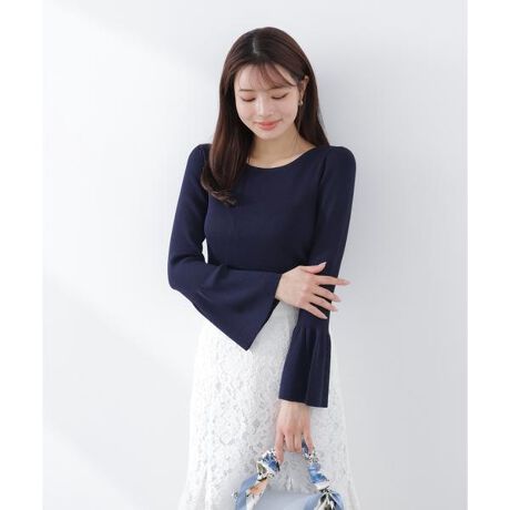 フレアスリーブが上品な印象のニットトップス。袖口に向かって広がるシルエットが女性らしく、手元をキレイに見せてくれます。袖口にポイントを作り、全体はシンプルで着回ししやすいデザインに。清涼感のある素材を軽めの肉感で編んでおり、春先まで長く活躍してくれます。