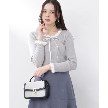 異素材デザインがポイントのニットトップス。襟と袖口にトレンド感のある異素材を施し、フロントリボンがレディな印象に見せてくれます。スカートと合わせたフェミニンスタイルはもちろん、デニムパンツと合わせた甘辛ミックスコーデもおすすめです。
