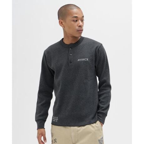 ・限定のヘンリーネック長袖Tシャツ・前後にステンシルプリント・独特のおうとつ感と柔らかい肌触りが特徴なハニカムワッフル素材を使用・少しタイトなシルエット・3色展開【AVIREX/アヴィレックス】
